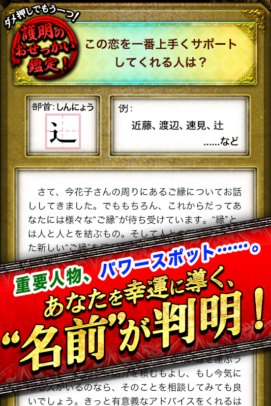 本アプリでは、地獄別府の鬼当て占師・護明による鑑定を受けることができます。