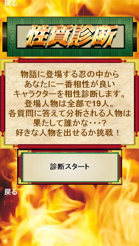 NARUTO(ナルト)に登場する人気キャラクターの中で、あなたに一番相性の良い人物が相性診断できます。忍術や物語から出題されるクイズも出来る非公式アプリです。