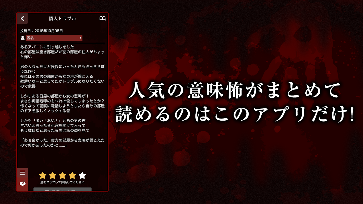 ユーザー投稿型 意味怖アプリの決定版!!誰もが知っている名作からオリジナルの話まで人気の意味怖がまとめて読めるのはこのアプリだけ!全話解説付きです。