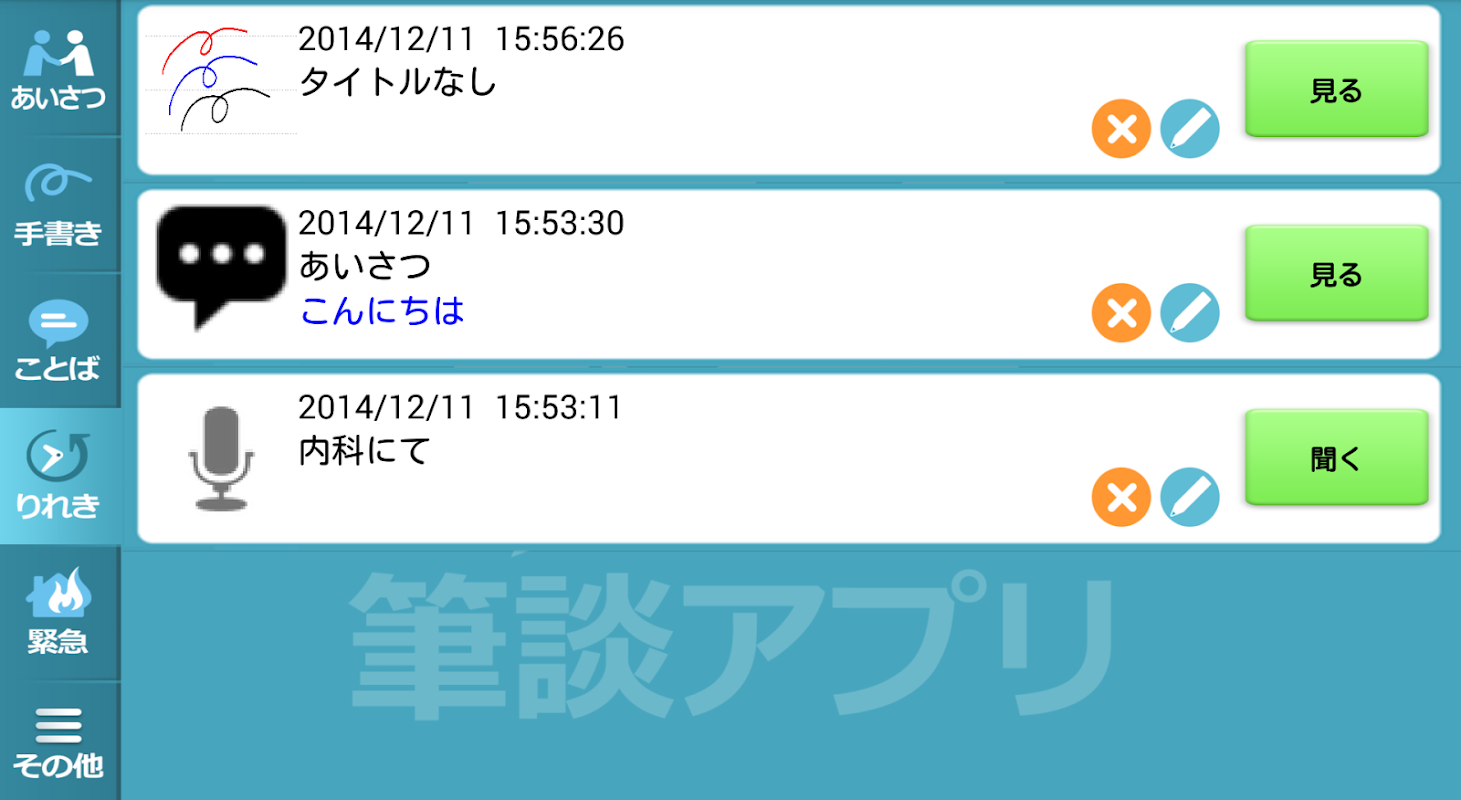 聴覚に障がいのあるかたが従来より利用している筆談器やFAX、メモ用紙などのコミュニケーション手段にて抱えていた問題点を改善する目的で開発したアプリです。