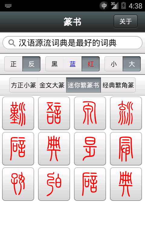 显示汉字的方正小篆、金文大篆、迷你繁篆书、经典繁角篆的写法,支持正写、反写。
