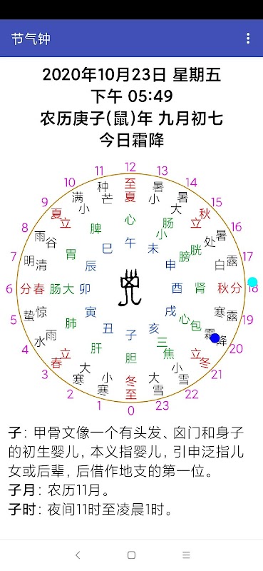 24 اصطلاح خورشیدی در یک سال و 24 ساعت در روز وجود دارد. این ریتم خورشید و ریتم زندگی است. اگرچه یک سال و یک روز از نظر مقیاس زمانی متفاوت است ، اما شباهت هایی در ریتم زندگی وجود ندارد. طب سنتی چینی معتقد است که qi و بدن بدن در امتداد نصف النهار مانند جزر و مد ، با ریتم جریان می یابند. روز پنجاه درجه حرکت می کند ، که بیست و پنج درجه آن یانگ ، بیست و پنج درجه دیگر یین ، پنجاه درجه یک هفته است. "جزر و مد" حرکت چی و خون در زمان های مختلف به نصف النهارهای مختلف می رسد و دوازده ساعت با دوازده نصف النهار مطابقت دارد. "Tidehead" حاوی انرژی فوق العاده ای است که عملکردهای ترمیم و بهبودی برای بدن انسان دارد. در طی فرایند ترمیم ، قسمتهای مربوط به نصف النهارهای بدن ممکن است واکنشهای فیزیولوژیکی داشته باشند ، مانند "سر جزر و مد" که از ساعت 3 تا 5 صبح به نصف النهار ریه می رسد. اگر ریه بیمار باشد ، در این زمان سرفه و آسم اتفاق می افتد. به همین ترتیب ، انتخاب زمان مناسب برای درمان نیز تأثیر چند برابری خواهد داشت.