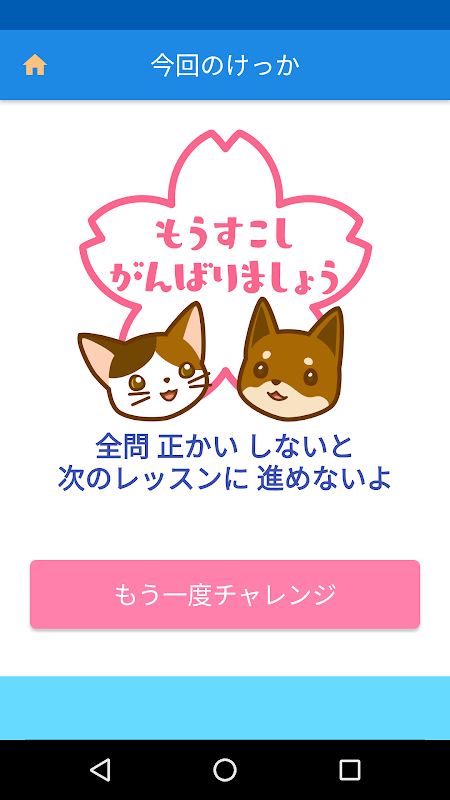・[レッスン]機能では、英単語帳で勉強した単語の確認テストができます。各レッスンで出題される問題を全て正解すると次のレッスンに進めます。サポートとして英単語の先頭の文字だけ最初から表示しています。分らないときは「パス」、間違ったときには「こたえ」をタップすると正解が表示されます。