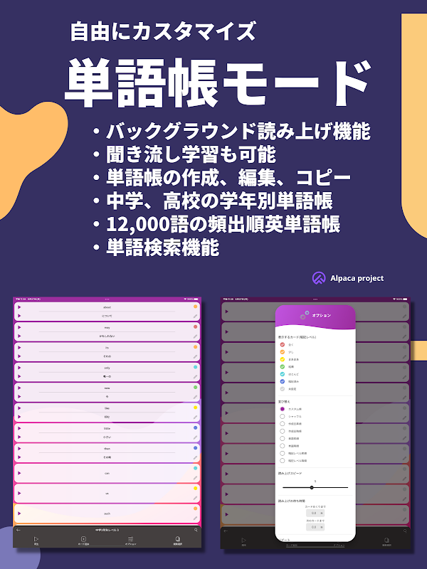 美しいデザイン、楽しく学習しながら確実に覚わる英単語帳アプリを目指しました。膨大な数の英単語を収録しながら、覚えやすいシンプルな対訳こだわり、中学や高校の学年レベルに合わせて毎日コツコツと学習を続けていくことができます。
