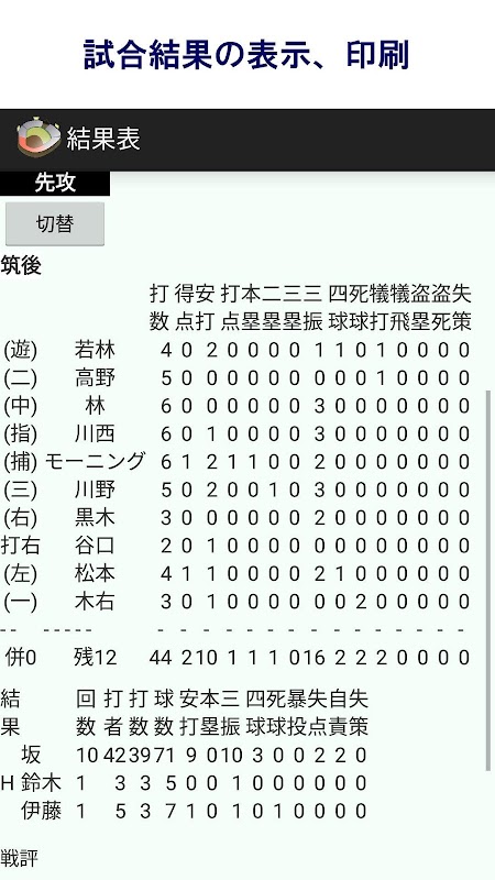 یک برنامه کتاب امتیاز بیسبال چند منظوره. شما می توانید نتایج دقیق (از چپ، با شمارش و غیره) را با یک ضربه زدن ساده ثبت کنید. عملکردهای مختلفی مانند انتشار آنلاین، بازی های لیگ و چاپ دارد.