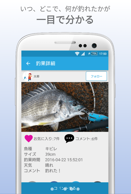 ナチュレコは釣果をアップすることで自分も釣果記録としてはもちろんの事、 釣り友達との交流や、今釣れている魚種情報などを簡単に確認することができます。