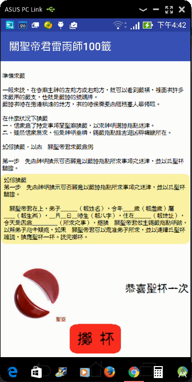 نسخه جدید «فال» را می توان به عنوان ارتقای قدرت خدای اصلی توسط هر کاخ و معبد در نظر گرفت، زیرا شامل تبلیغات است، هر دو طرف بالا و پایین قرعه با رنگ قرمز به عنوان پایه ترسیم می شوند خوشحالی. قسمت "داستان" به دلیل اشعار امضا شده مدت زیادی است که پخش می شود و در همه فیلم ها و برنامه های تلویزیونی (مانند داستان لوژو، داستان پانگجوان سان بیندو، داستان وانگ ژائوجون...) و حکایت ها قابل مشاهده است. در بسیاری از کتاب ها پراکنده شده اند و می توانند به عنوان مرجعی برای تاریخ غیر رسمی در نظر گرفته شوند. برخی از نوشته ها طولانی است، بنابراین ممکن است این برنامه پر کلمه ترین برنامه باشد، اما به آنچه من به عنوان یک کتاب الکترونیکی فکر می کنم نزدیک تر است. با افزایش سن، فکر من در مورد توسعه دهندگان ممکن است این باشد که بسیاری از مردم فکر می کنند که ما خیلی راحت هستیم، و مردم ممکن است مذهبی نباشند امروزه، تشکیل احزاب و انجمن ها رایج است، و در تعداد زیاد است. تصمیم بگیرم تجارب و داستان های بیشتری را اضافه کنم کمی درک و ناآگاهی باعث کارهای مشترک جبران ناپذیری در آینده می شود حتی اگر آن بچه ها فکر کنند که تاریخ بسیار دور است. خارجی ها ممکن است این را درک نکنند، چندین حوزه وجود دارد که من انتظار نداشتم آنها را به هنگ کنگ ببرند داستان "رستاخیز Tian's Bauhinia" خیلی مرا تحت تأثیر قرار داد، بنابراین آن را به یک فایل متنی تبدیل کردم. همین امروز، اگر مردم در مورد آن به نفع خود صحبت کنند، به جای تاریخ و واقعیت، این تجربه من است که پس از تماشای تبلیغات و ارتباطات چندین ساله در قصرها و معابد وجود دارد طبق تعریف، این یک سازمان خیریه است که مردم طبقه پایین را نجات می دهد، اما به یک ایمان واقعی چینی تبدیل شده است که نامحسوس است.