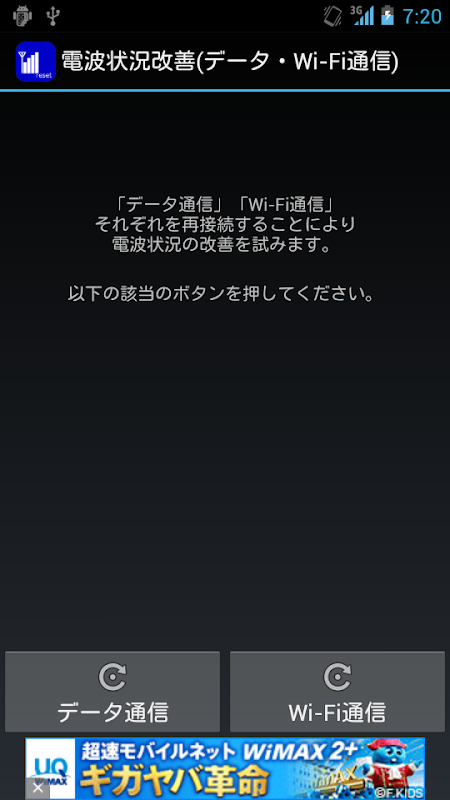 ※当アプリはデータ通信及びWi-Fiを一度OFFにし再度ONに戻すことにより電波状況の改善を行っています。その為、元々電波状況が悪い場所では効果はありません。