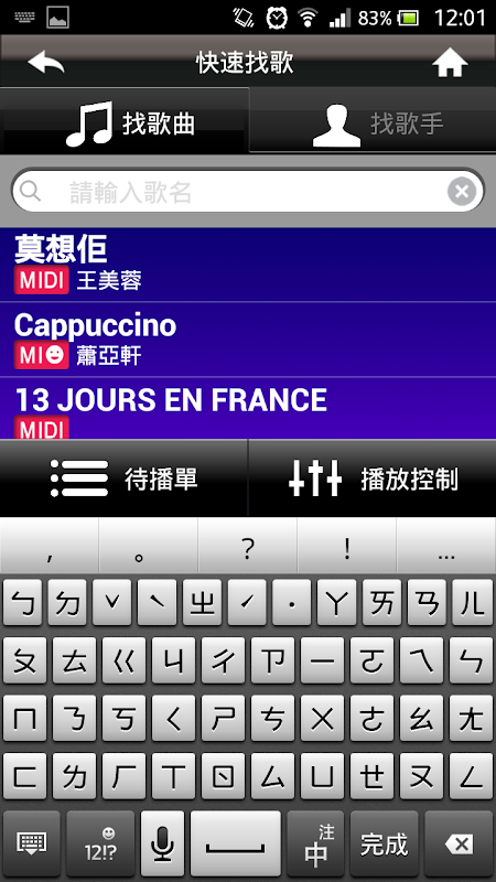 4. 支援手機、平板各式標準之輸入法,可快速搜尋歌名或歌手名。