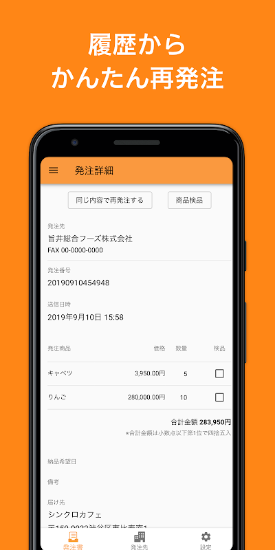 飲食店が食材を発注する際に利用できるアプリです。アプリから発注内容を送信すると、FAXまたはメール宛に自動変換された発注書が卸会社に送信されます。ご利用は無料!