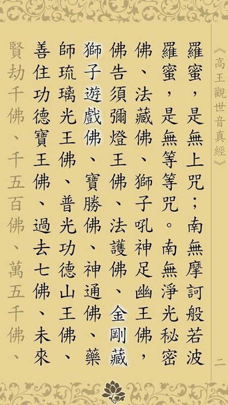 除了精緻的文字顯示,本程式提供了經咒念誦的功能,並且於每個章節經句章節細心的引導你,免除了紙本經本使用上,初發心的菩薩們常會遇到的問題,如跟不上、找不到等等的問題影響持誦的順暢。