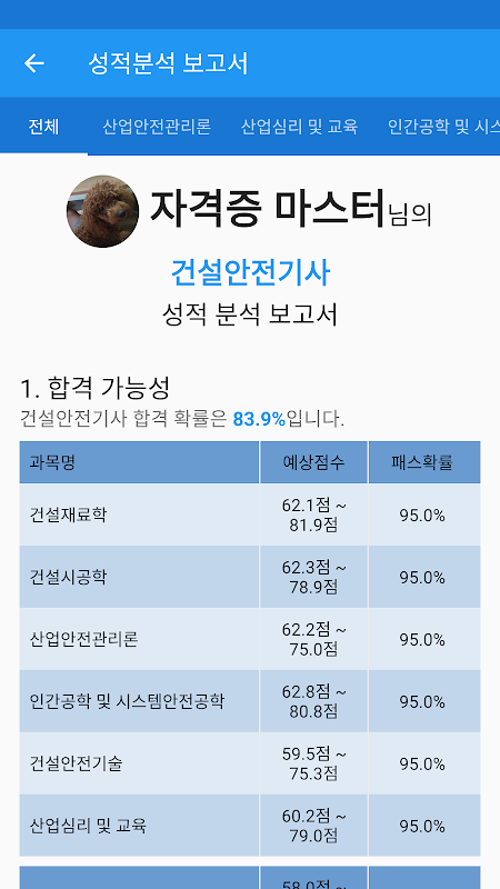 성적확인 - 각 과목별 성적 및 그동안 풀어본 기출문제와 모의고사, 문제풀기의 성적을 볼 수 있습니다.