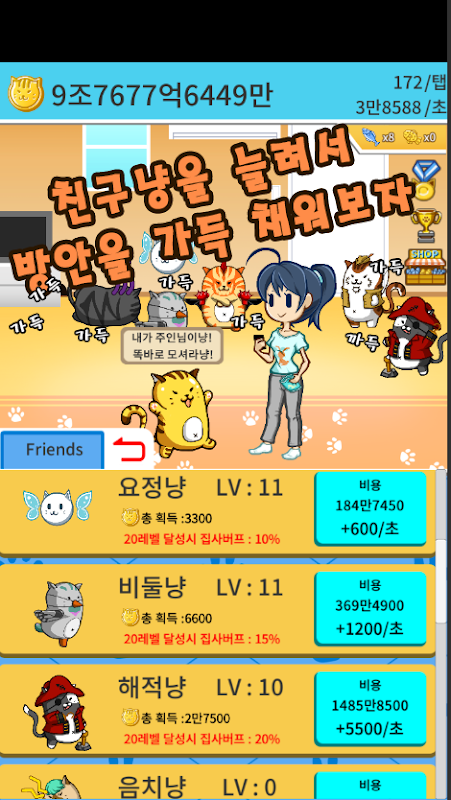 집사의 레벨을 올리면 스토리와 함께 클릭(탭)당 금액이 올라간다냥