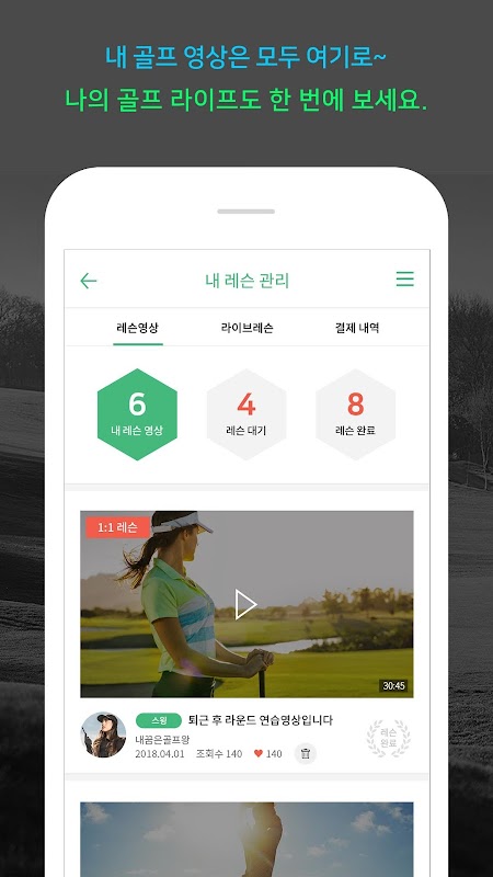 - 골프 스윙 자세 교정, 비거리 향상, 드라이버 잘치는 법, 골프그립 등 골프실력향상을 위해 영상을 등록하고 이어골프 프로님들에게 레슨을 받을 수 있는 메뉴입니다.