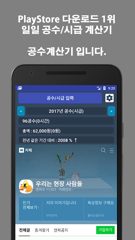 공수와 시급을 달력에 기입하여 자동으로 계산해 주는 앱입니다. 카페와 연동하여 유용한 정보와 푸시메시지로 취업정보를 받으실 수 있습니다.