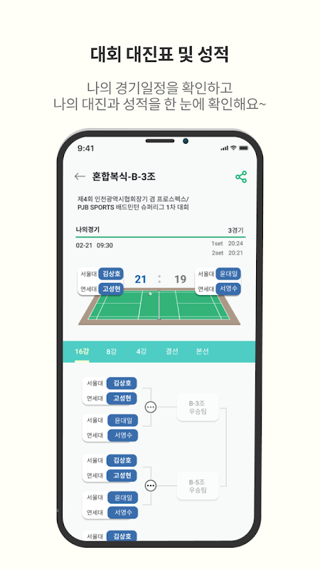 - 대회 참가 신청부터 경기 일정, 대진표 확인을 편리하게 할 수 있어요