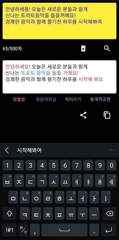 آیا با املای کره ای مشکل دارید؟ اکنون می توانید از برنامه ما برای کاملتر کردن نوشته خود استفاده کنید. اگر جمله یا کلمه ای با حداکثر 500 کاراکتر در برنامه وارد کنید، به طور خودکار املای شما را بررسی می کند و اصلاحات را پیشنهاد می کند. علاوه بر این، محتوای اصلاح شده را می توان بلافاصله کپی یا به اشتراک گذاشت، که بسیار راحت است.