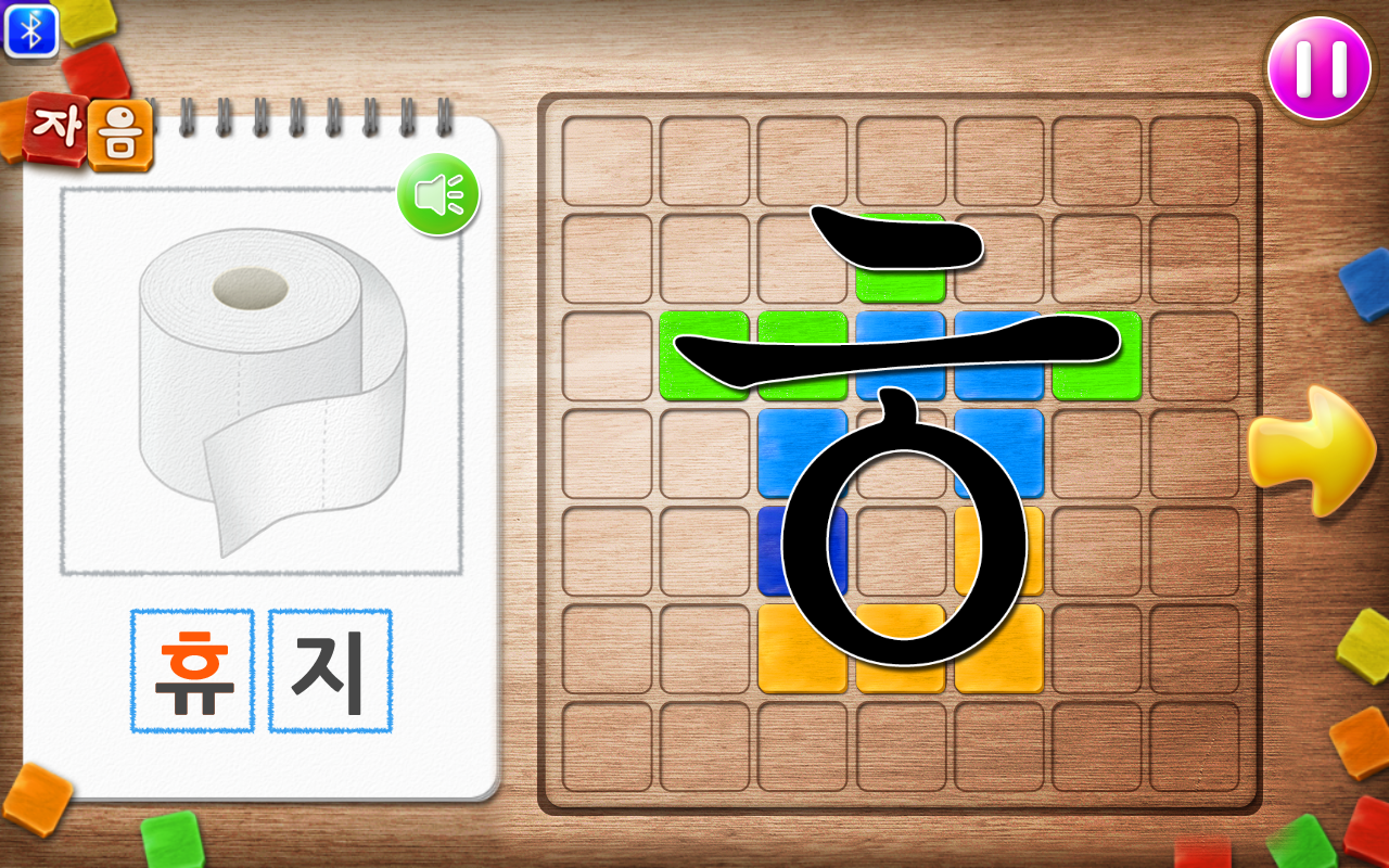 화면에 나오는 가이드를 보드판에 동일하게 꽂으면 한글이 완성되며, 해당하는 글자의 획 순 등도 학습할 수 있습니다.