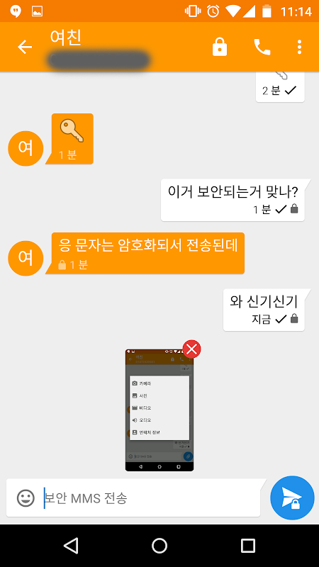 비밀문자를 사용해 사생활이 완전히 보호된 방법으로 SMS 메세지, 미디어, 첨부 파일을 보낼 수 있습니다.