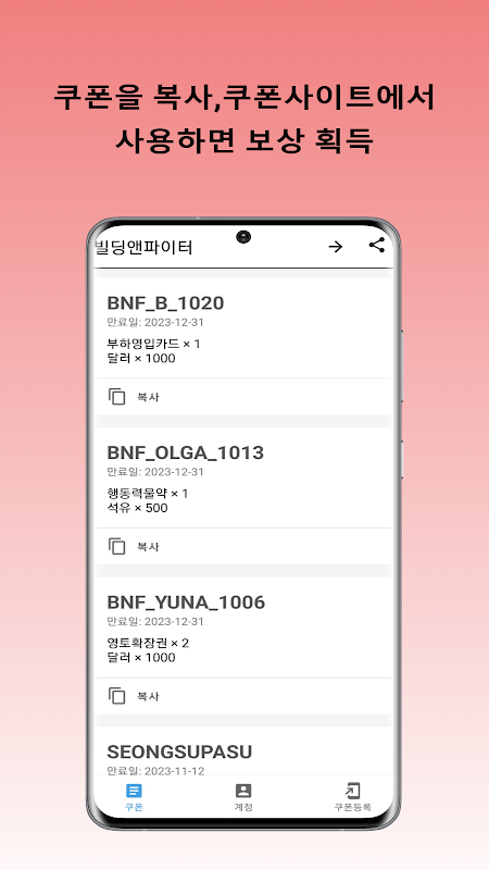 قبل از انقضا از کوپن استفاده کنید. میتوانید اطلاعات کوپن را برای «Building & Fighter» نمایش دهید و هنگام صدور کوپنهای جدید، اعلانهای فشاری دریافت کنید.