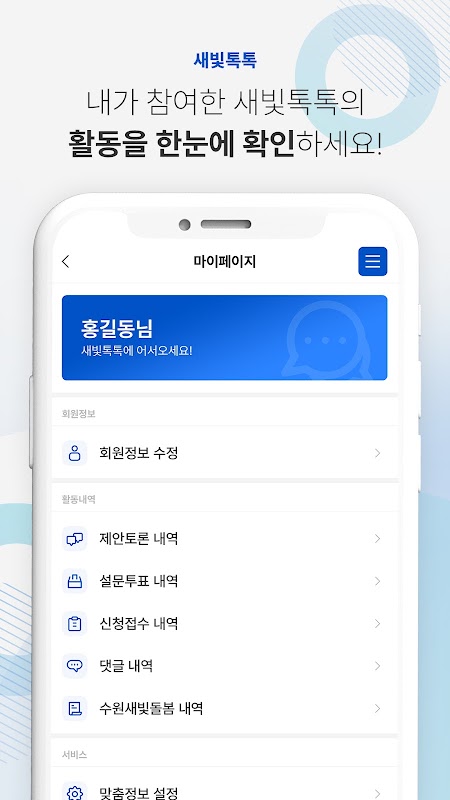 پلتفرم مشارکت شهروندان سیار Saebit Tok Tok یک پنجره ارتباطی دو طرفه است که در آن شهروندان سیاست هایی را به شهر سوون پیشنهاد می کنند، نظرات شهروندان را در خط مشی ها منعکس می کنند و از طریق نظرسنجی، رای گیری و برنامه ها نظر شهروندان را می پرسند. ما خدماتی مانند: