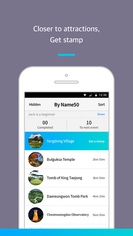 1. 스토어에서 '스탬프투어'를 검색, 2. 앱 내의 '신라 천년의 고도, 경주'를 선택, 3. 경주스탬프투어 진행하세요.