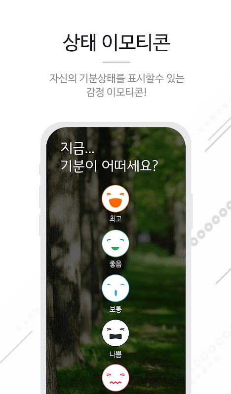 자신의 기분상태를 표시할수 있는 이모티콘과 그림노트(펜 그리기)로 나만의 이야기를 만들수 있습니다.