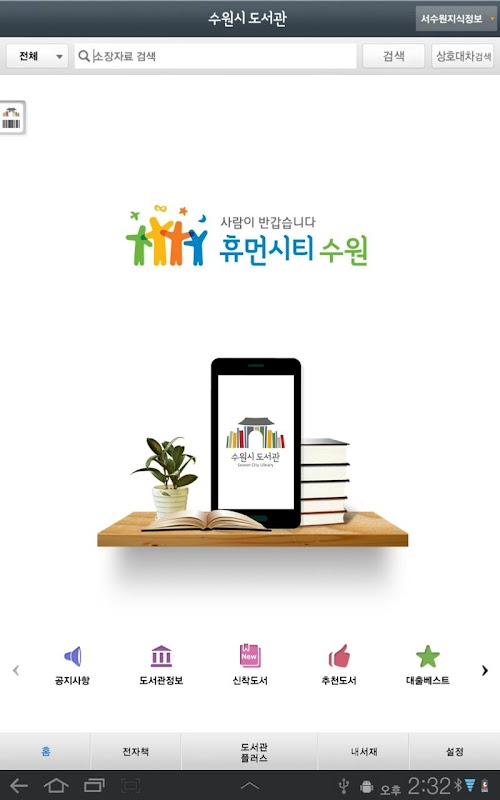 Books for Public Libraries in Suwon area, you can take advantage of features such as mobile membership, library guides, e-books, loan status and history.
