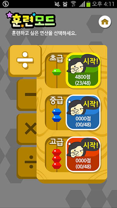 훈련 모드 덧셈, 뺄셈, 곱셉, 나눗셈을 각각 초급, 중급, 고급의 과정으로 나누어 1단계부터 차근차근 연습할 수 있도록 구성하였습니다. 또한 사칙연산을 신속하고 정확하게 계산하는데 목적을 두고 일의 자리부터 차례로 숫자를 입력하도록 제작 되어 있습니다.