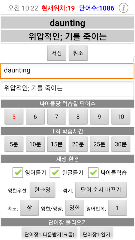 چرخه واژگان انگلیسی است به طور خودکار کمک می کند تا به شما برای یادگیری به خواندن کلمات انگلیسی شده و به راحتی یاد بگیرند کلمه انگلیسی و شنیدن. به خصوص به حداقل پنج بار قبل از ناپدید شدن از چرخه به یاد داشته باشید یادگیری از طریق سیکل تکرار می شود و در یک کلام یاد بگیرید چگونه با استفاده از اصل حافظه کوتاه مدت. هنگامی که به چرخه مجموعه پنج بار به شنیدن کلمه 1،2،3،4،5 4،5،6،7 تعداد دفعاتی 2،3،4،5،6 3،4،5،6،7 کلمه با توجه، به بازی چند بار 5،6،7،8،9 6،7،8،9،10 شماره 8 کلمه کلمات مطالعه بارها و بارها از پنج برابر کلمات شما به تازگی به دست را به استفاده از به طور پیوسته ایمان اگر شما می توانید به یک نتیجه خوب است. علاوه بر این، شما می توانید دانلود و استفاده از واژگان انگلیسی شما یک توسعه دهنده ارائه شده در نسخه اولیه نرم افزار واژگان انگلیسی TTS ایجاد کرده اید، شما می توانید زمان شخصی برای ایجاد صرفه جویی کنید. تعیین تعداد کلمات انگلیسی به خواندن، شما می توانید یک زمان تعیین یادگیری توسعه، کلمات اضافه کنید، حذف، تغییر ویژگی های، هرگز کلمات، HANYOUNG تغییر، تغییر تصادفی در سفارش کلمه، قابلیت نمایش افقی، از جمله پشتیبانی از مهارت های واژگان آسان در یک روز شلوغ به عنوان خوانده شده. لطفا موتور گوگل TTS در پیش نصب کنید. متشکرم.