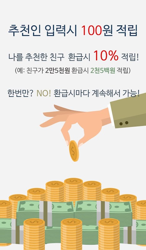 나를 추천한 친구가 적립금 환급시 금액의 10%를 나에게 보너스로 적립되며 한번이 아닌 환급시마다 보너스가 발생됩니다!