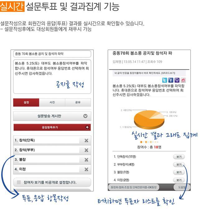 5. 스마트폰으로 행사참석여부등 설문, 투표 결과를 실시간 집계하고 항목별 응답자 현황도 확인할 수 있습니다.