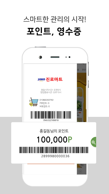 - 진로마트 사동점의 포인트 카드를 모바일로 편리하게 이용하시고, 언제 어디서든 포인트를 확인하실 수 있습니다.