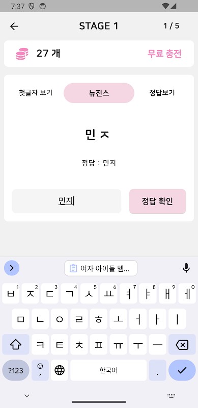 APKPure از تأیید امضای نرمافزار برای اطمینان از دانلودهای بدون ویروس APK 초성퀴즈 한글자 - 여자 아이돌 멤버 테스트! استفاده میکند.