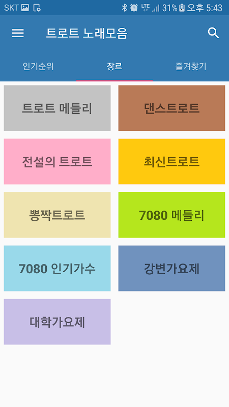 매일 새롭게 등록되는 최신 트로트 가요들을 인기수위와 추천곡 화면에서 손쉽게 확인이 가능합니다.