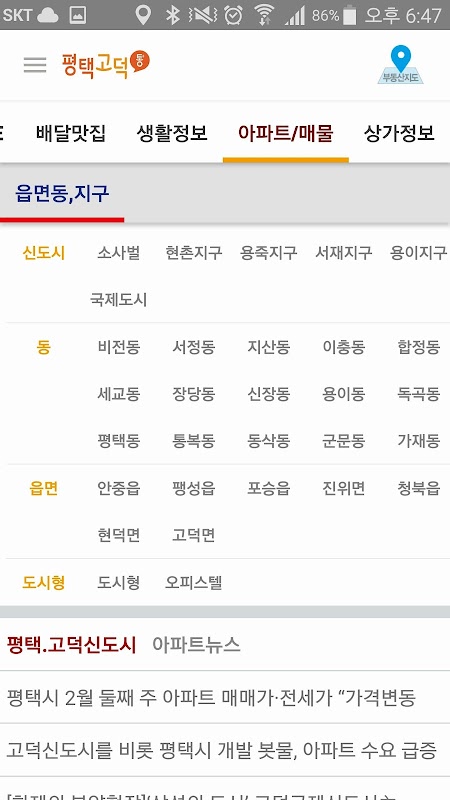 평택시 전지역의 배달음식정보, 맛집정보와 신도시 지역의 아파트정보, 상가 분양정보 및