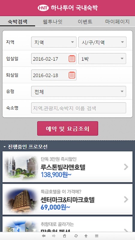 "하나투어 국내숙박"에서 전국 숙박 할인 요금 및 방 상황을 실시간 조회하여 경쟁력 있는 요금으로 숙박 예약 및 다양한 혜택을 누리세요. (당일예약가능)