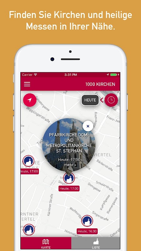 برنامه 1000 کلیسای شما می دهد فرصتی برای پیدا کردن توده در منطقه خود است که در ساعات آینده امروز یا فردا. شما به راحتی می توانید یک کلیسا در نزدیکی مکان فعلی شما و یا در سراسر قلمرو مذهبی اسقف اعظم وین پیدا این که آیا در مرکز وین، در سه ماهه شراب و یا در Raxregion شما در خدمات مناسب را پیدا کنید برای شما!