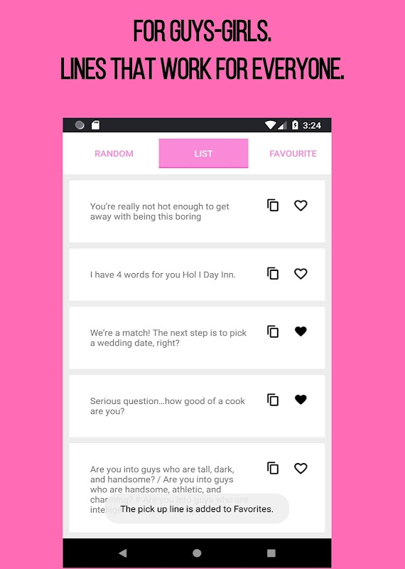 Swipe or scroll through the pick up lines, add them to your favorites and send the best ones to your partner.