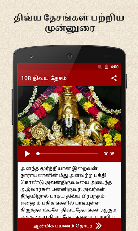 شعار اصلی ما این است که کاربران خود را به بازدید از همه 108 معبد برسانیم که از طریق آنها زیبایی می گیرند. بنابراین با خود عهد کنید که ابتدا از Divya Desams در اطراف شهر خود بازدید کنید و سپس بازدیدهای خود را از مناطق دیگر گسترش دهید.