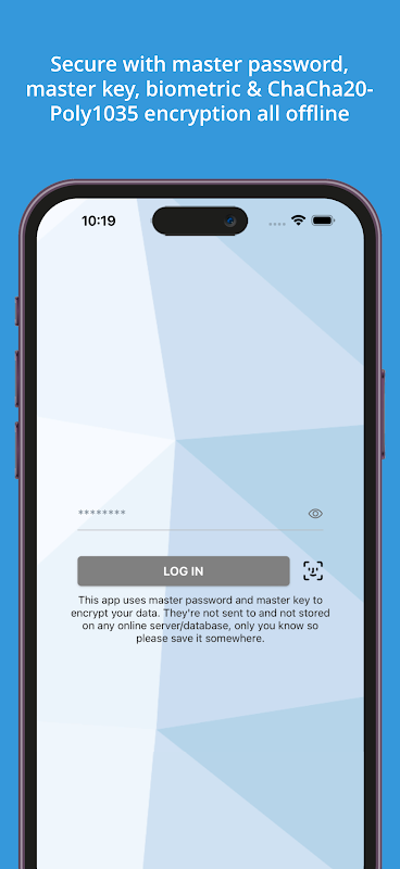اطلاعات شما با رمزگذاری 256 بیتی ChaCha20-Poly1305 محافظت می شود، همان رمزگذاری استاندارد صنعتی که توسط Google انتخاب شده است. همه چیز - از تنظیم رمز عبور اصلی تا ذخیره داده های شما - به صورت آفلاین در دستگاه شما اتفاق می افتد و از حفظ حریم خصوصی کامل اطمینان می دهد.