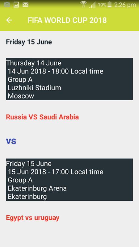 You can know all match time schedule of world cup 2018 (Russia). also can know date, local Time, stadium name.