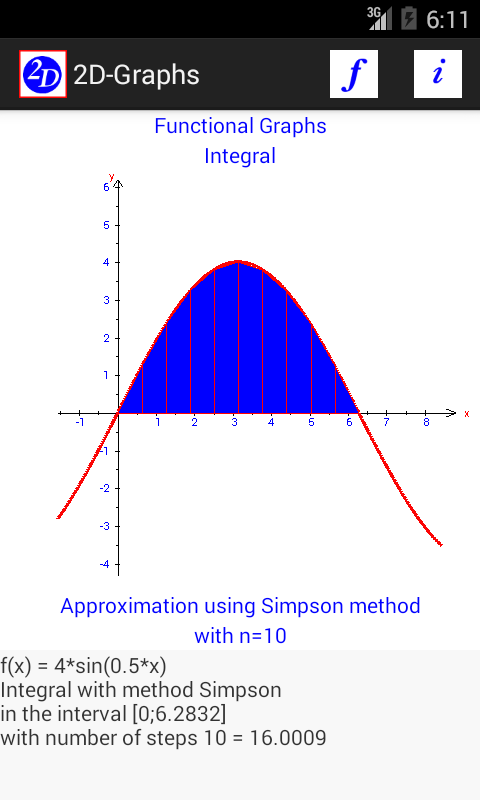 برنامه 2D-نمودارهای ارائه می دهد نمایش گرافیکی از نمودار تابعی از نوع F (X) یا (X (T)، Y (T)). این شامل محاسبه تقاطع ها، صفر و اکسترمم. یکی از تخصص توسعه تعریف انتگرال با تعدادی از روش های است. در میان این مبالغ بالا و پایین، طناب بند و روش Simpson، نشان دادن تقریبی از مقدار انتگرال است. علاوه بر منطقه betwenn دو نمودار را می توان محاسبه شده است. برای هر نمودار، شما ممکن است یک مکان، که در آن برنامه محاسبه شیب و تساوی مماس مربوطه را تعریف کنیم.