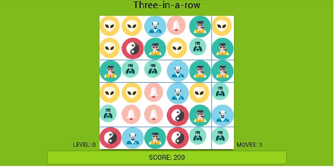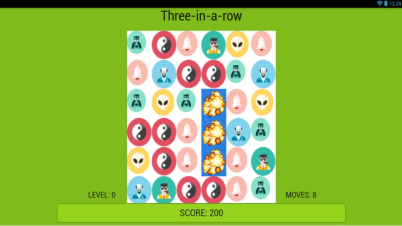 Three same in row makes explosion and produce new combinations to get three in a row.