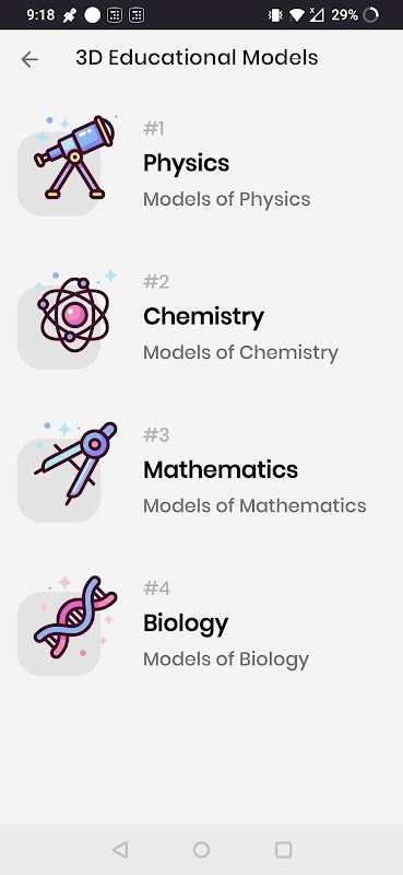 3D Educational Models App contains Physics, Chemistry, Mathematics or Biology 3D Models. These 3D Models can be used in Education during Teaching as well as in self-learning.