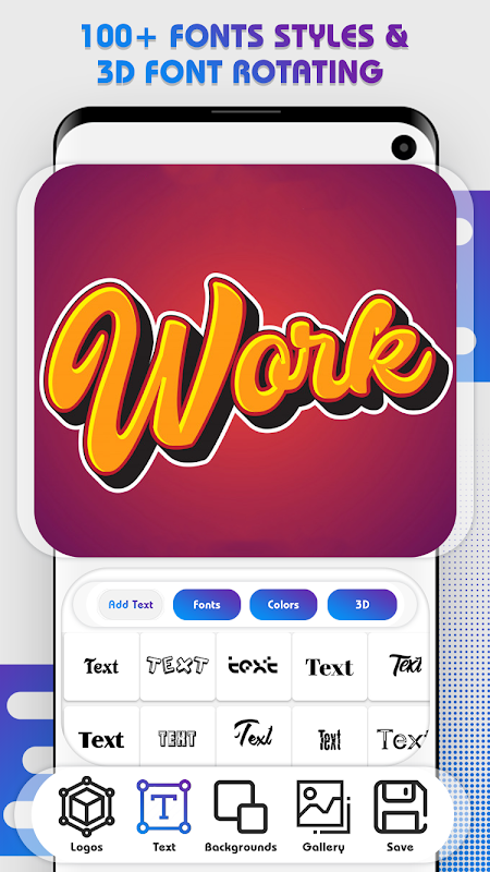The best text editing options you can add or edit your text freely You can change color of your text and you can use any font style it has many font styles you can easily apply any font it contains 2D font styles and 3D font styles.it is the best tool ever You can use it as stylish text on photo,3D stylish text on Photo because you can write text on Your photos,logo generator,logo in picture,you can use it as icon designer maker make or generate icons free.now you no more need to use heavy designing software or hiring a professional to create a logo or icon for you or your brand.it is the best Logo maker - Logo Creator, Logo Generator & Logo Designer,logo name maker with Following Features: