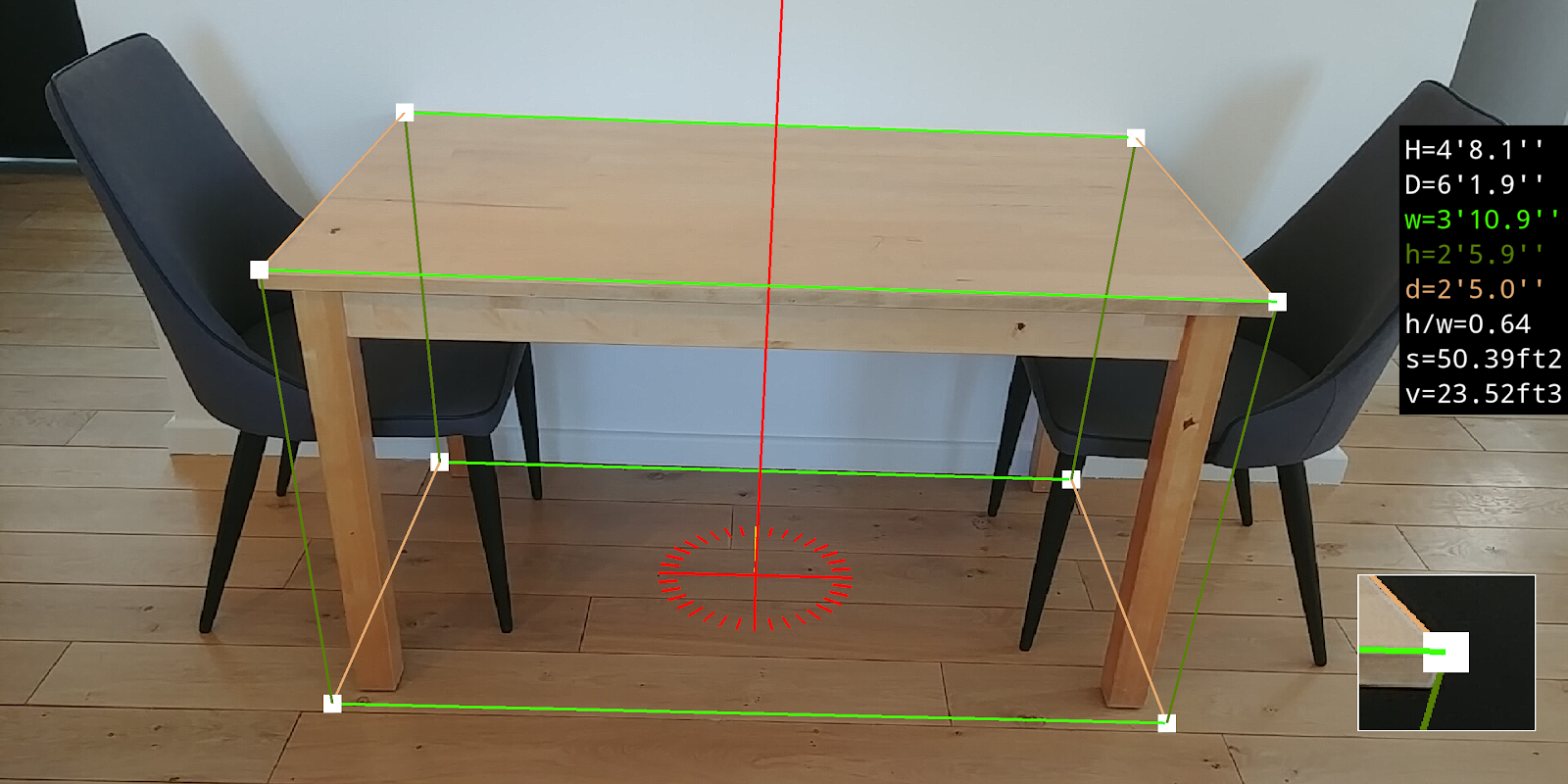 برنامه اندازه گیری 3D - Plumb-bob + برنامه واقعیت افزوده است که یک قاب مجازی را در بالای تصویر دوربین نمایش می دهد. این قاب بدون در نظر گرفتن جهت دستگاه شما عمودی است. ابعاد قاب در زمان واقعی نمایش داده می شود.