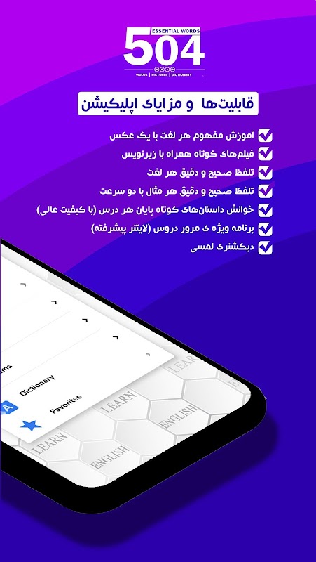 این برنامه شامل 42 درس است که هر درس به شما 12 کلمه جدید می آموزد.