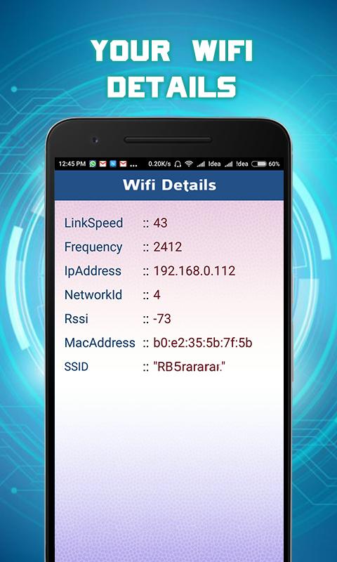 - Get WIFI connection details : Link speed, Frequency, IP Address, Network, RSSI, MAC Address and SSID
