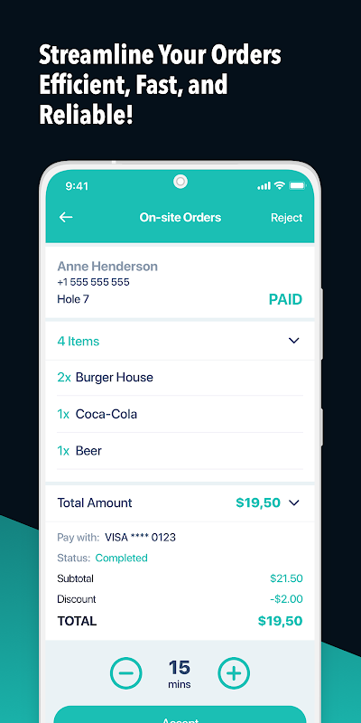 - قرار دادن آسان سفارش: گلف بازان می توانند مستقیماً از تلفن های هوشمند خود هنگام حضور در مسابقه سفارش دهند. نیازی به صبر نیست - سوراخ نوزدهم فقط چند ضربه دورتر است!
